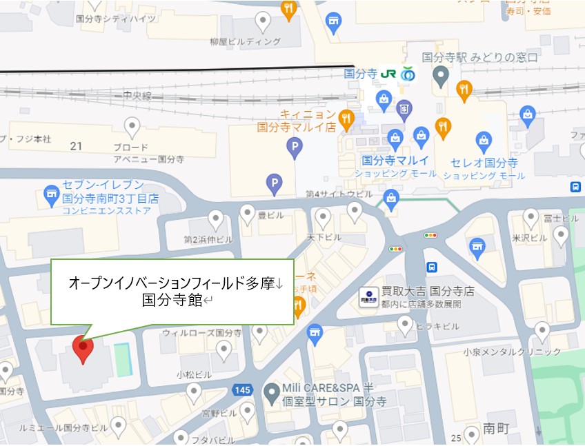 オープンイノベーションフィールド多摩 国分寺館 4Fセミナールーム1 〒185-0021 東京都国分寺市南町3-22-10 アクセス JR中央線「国分寺駅」徒歩5分 |