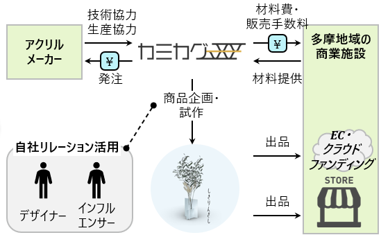 具体的には、多摩地域の商業施設で廃棄されたアクリルパーテーションを素材として、アップサイクル製品の開発を行い、持続可能性のあるビジネスとなり得るかを検証します。