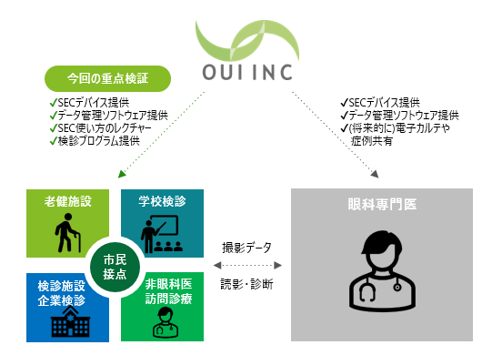 スマートフォンのカメラに外付けできる眼科医療機器「Smart Eye Camera (SEC)」を活用した簡便な眼科診察を実施、眼科疾患の患者さんをスクリーニングし、眼科受診に繋げるモデルを実証します。