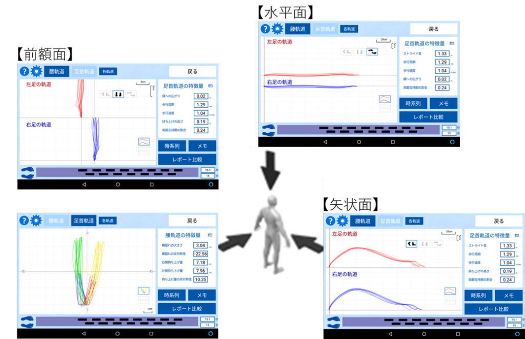 本システムでは、患者の両足首と腰にベルトで装着した加速度センサーにより、一歩一歩の歩行の三次元軌道の推定を行うことができます。また分析結果をクラウドシステム上で確認することができます。
