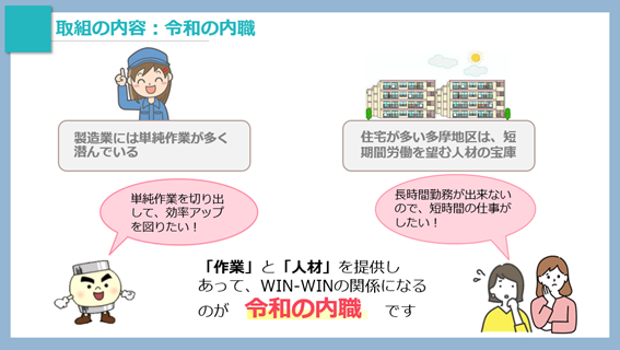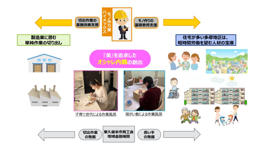 本実証では、製造業に潜む生産効率低下を招いている工程から作業を切り出し、地域の美容エステサロンや障害者サービス・生活訓練事業所と連携して、作業に関する受発注や、作業支援を実施できる仕組みの構築を検証します。