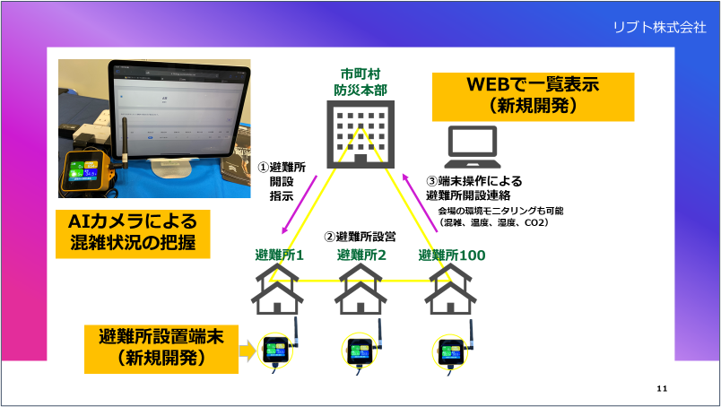 本システムでは、ボタン一つで、災害対策本部への避難所開設の連絡や、開設状況のWEBページへの表⽰等の機能を実装します。加えて、避難所の混雑状況、換気状況(CO2濃度)、温湿度の⾃動取得機能を開発し、市町村の災害時支援に役立つかを八王子市と検証します。また、平時での利用も検討していきます。
