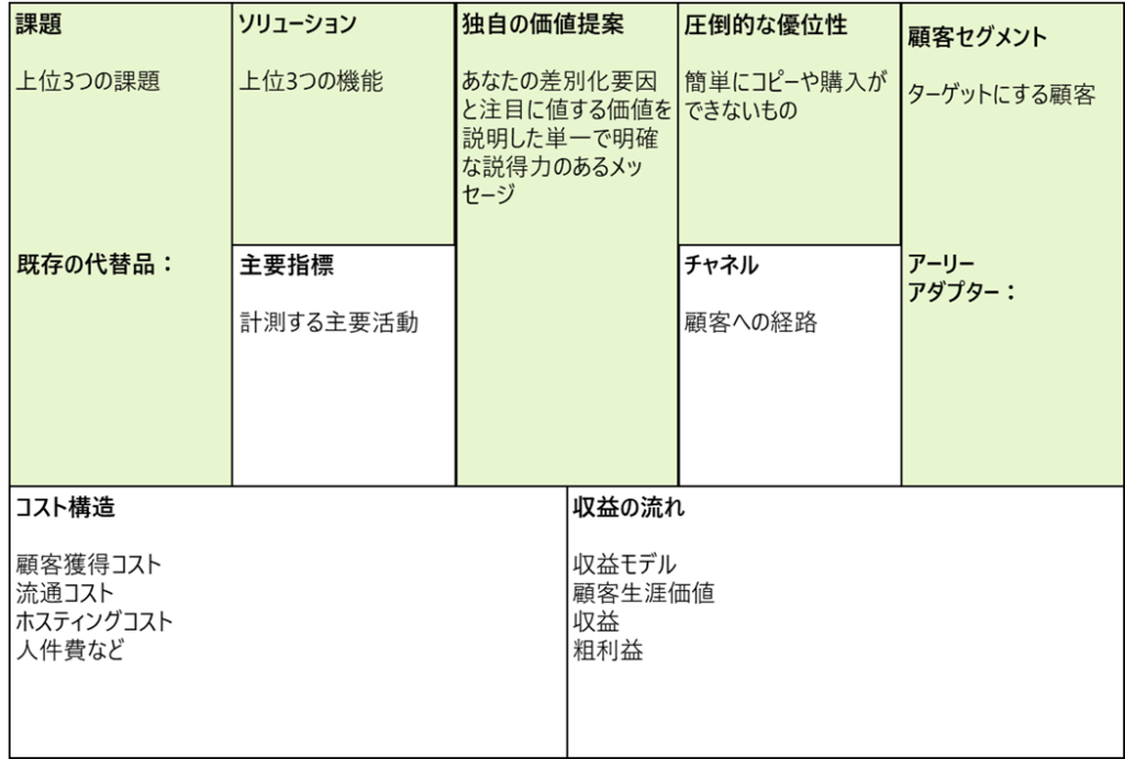前回、前々回の復習を兼ねてリーンキャンバスの解説をしました。