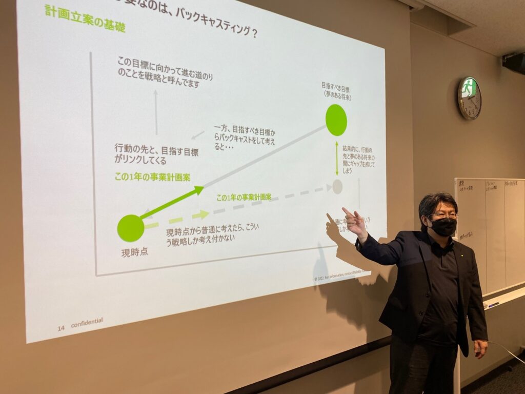 夢のある将来(目標)を打ち出した後に必要になるのは、目標を叶える道筋です。これを一般的に戦略と呼んでいます。戦略(=事業計画)を考える時、まずは自分たちの現在地を正確に把握する必要があります。目標と現在地を明確にし、目標から現在地を逆算することで、次の一年間に何をしなければならないかが見えてきます。これをより具体的に明記していくことで事業計画が夢とリンクすると共に現実性が帯びていくことになります。