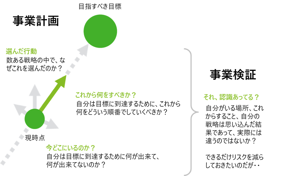 事業計画の中で記載すべき項目の中に「事業検証」が挙げられます。これは、目標と現在地から逆算した戦略が実際と乖離がないかを確認する手段になります。戦略の中では「数ある戦略の中でなぜこの戦略を選んだのか」「目標到達に向けて何をどのような順番で行うか」を記載しますが、その戦略が本当に最適か、あるいは環境や状況の変化で戦略の変更が必要になる場合もあります。その意味で事業検証により現在の戦略が目標に向かう道筋として最適かどうかを確かめることができます。また、大小リスクの伴う事業への投資において、できる限りリスクを減らす意味でも事業検証の具体性は投資に直結するものになります。