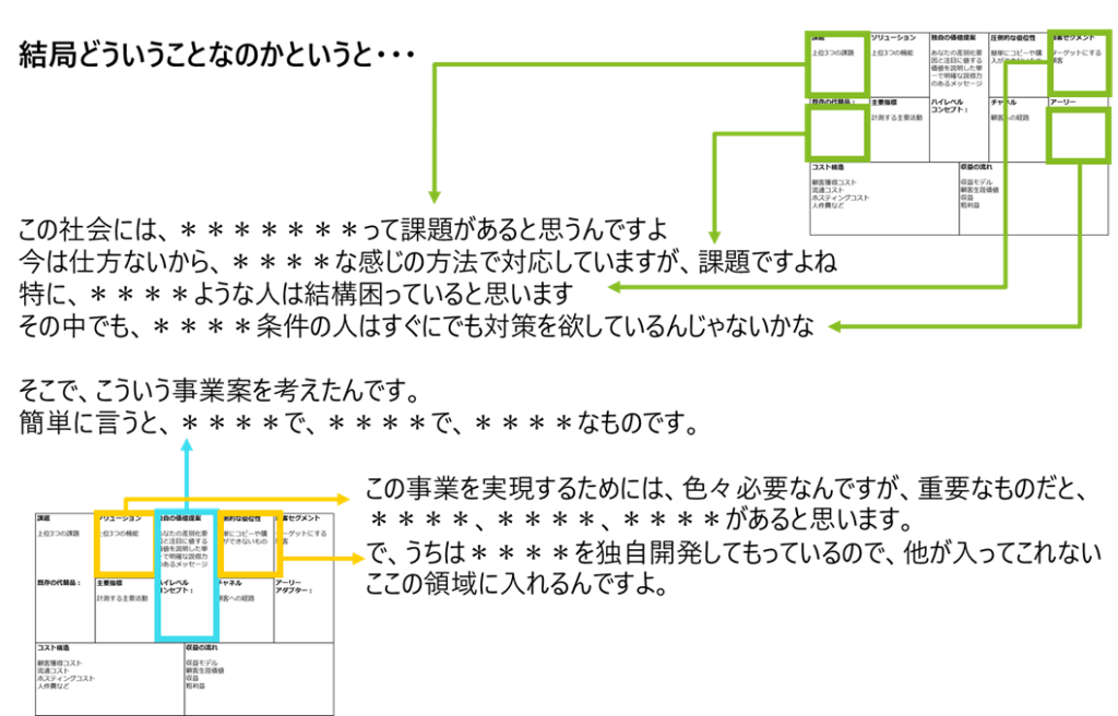 今回は作ったリーンキャンバスを最終的に提案書/プレゼンテーションにどのように落とし込むかについて解説しました。提案書やプレゼンテーションにおいては、さまざまな形式やフォーマットがありますが、大事な点は、作成したリーンキャンバスをベースに、提案書の読み手やプレゼンテーションの聞き手が、下図に記載したストーリーが容易に理解できるような内容を意識して作成することです。
