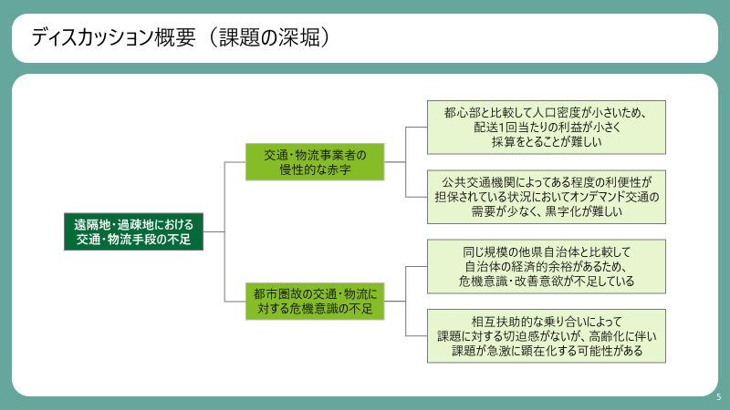今回は特に前回のWSで議題の中心となった「遠隔地・過疎地における交通・物流手段の不足」についての課題が挙げられました。物流・交通手段が不足している原因は大きく「交通・物流事業者の慢性的な赤字」「都市圏故の交通・物流に対する危機意識の不足」が挙げられます。これらに対応していくために物流に関わる物流・交通事業者だけでなく、自治体やITシステム導入企業と協力しての物流全体の改善が求められます。