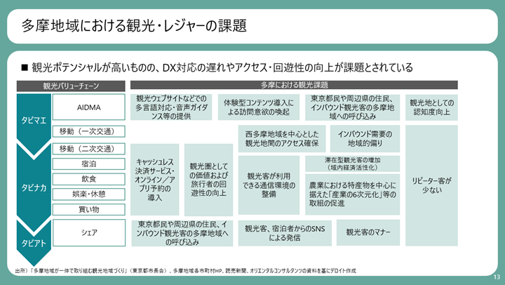 このように多摩地域には観光資源が豊富にありますが、その一方でDX対応やアクセス・回遊性といった課題が解決されておらず、十分にその魅力を発信し、集客できていないのが現状です。