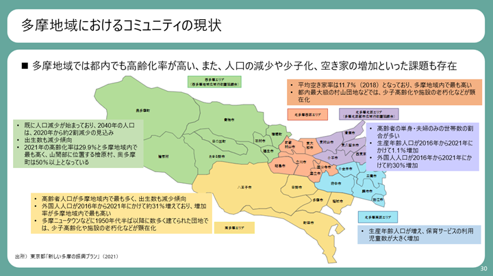 その一方で、多摩地域には「少子高齢化」「マンションなどの老朽化や空き家の増加といった住環境の再構築」「地域人口の減少」「大規模工場の撤退、農業従事者の減少などによる産業構造の再設計」といった課題があります。