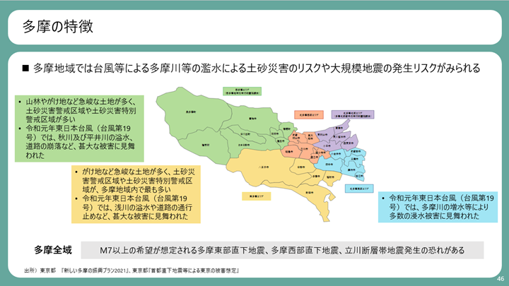 多摩地域は山林やがけ地など急峻な土地が多い地域や多摩川、秋川などの河川が通っている地域があります。このような地域においては台風や大雨によるがけ崩れ、河川の氾濫といったリスク、さらには大規模地震発生のリスクもあり、防災に対する備えが必要となります。