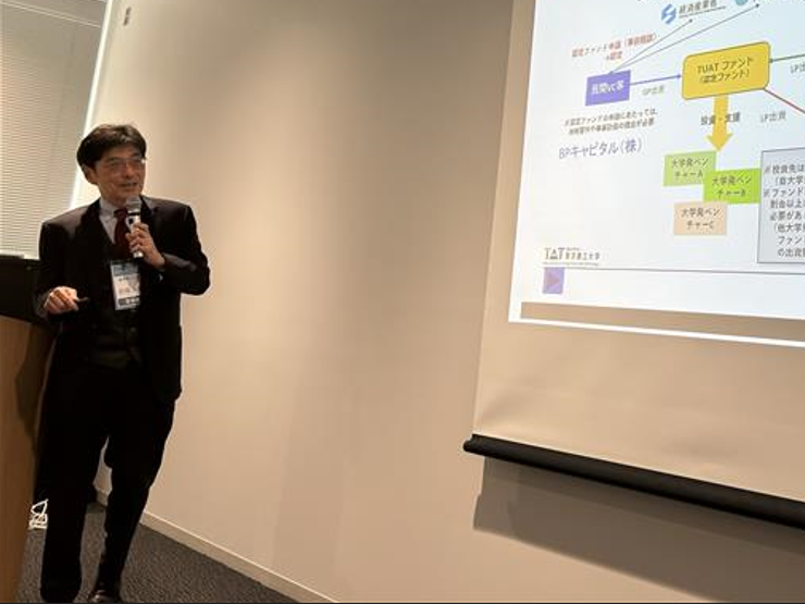 東京農工大学の前畑氏様からは、まず2024年に創基150年を迎える東京農工大学のビジョンについてご説明がありました。次に、ビジョンに基づきBPキャピタル株式会社と共同で設立した認定ファンド「TUATファンド」に関する説明に加え、民間資金導入による取組、「食」に関する地域連携・起業支援施設の整備等の各種取組についてお話しいただきました。