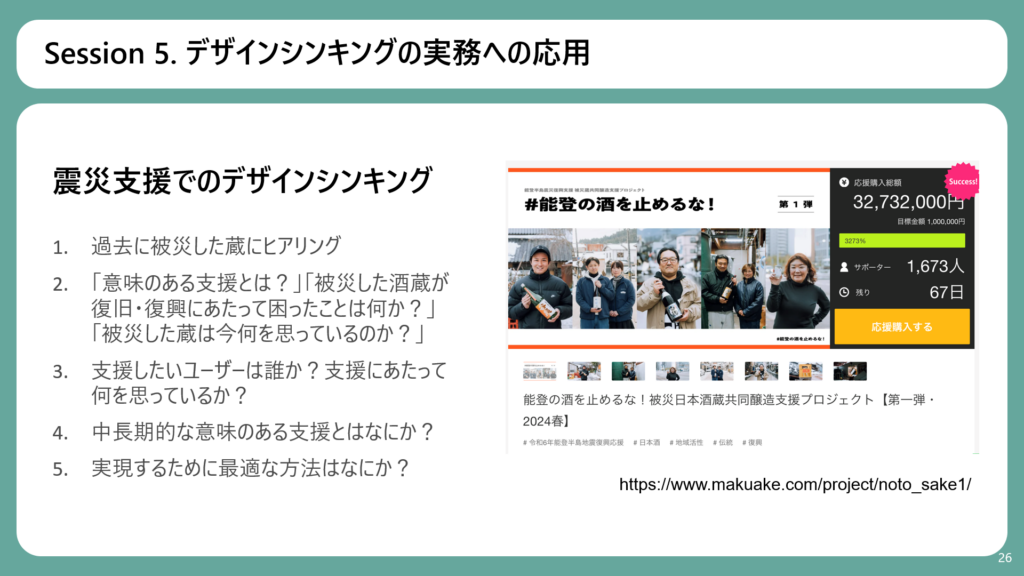 実践編では、デザインシンキングを活用した事例としてカワナ氏が現在取り組んでいる『#能登の酒を止めるな!被災日本酒蔵共同醸造支援プロジェクト』についてお話しいただきました。