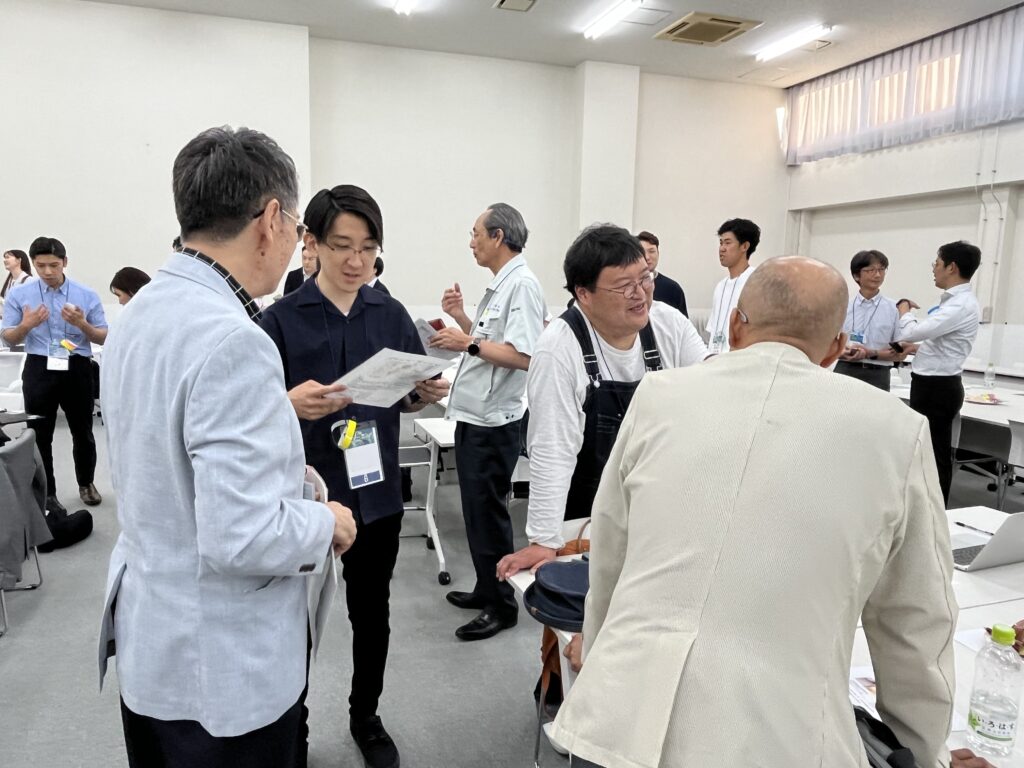 自由参加の交流会では、ワークショップで共有した原体験をもとに「今後取り組みたいこと」「今までの取り組んできたこと」「自社のミッション」等、より深いディスカッションに繋がっていました。また、名刺交換や事業内容の紹介を通じて、今後予定している取組や実証先としての提携に向けた打合せの設定、共通テーマでの協業に向けた検討等、具体的な議論に結びついた交流も行われました。
