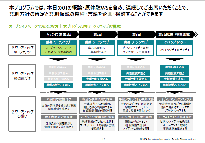 「事業構想ワークショップ」は、全3回開催を通じて、協業による新たな事業案の策定に向けた講義及びグループワークを実施する内容となっています。10月以降実施予定の「事業発信ワークショップ」は、マーケットイン型の事業案の着想・ブラッシュアップや、事業推進に関連する支援者・協力者との交流・連携の促進を目的としています。8月より開催する「プロジェクト創出ワークショップ(リバースピッチ)」では、地域課題解決に取り組む大企業や自治体等が抱えている課題やニーズについてご紹介いただき、マーケットイン型のプロジェクト創出に繋げます。「アイデア具現化支援」は、社会実装に向けて取り組みを進めているビジネスアイデアを募集し、ハンズオン支援を通じて、次年度以降の実証に向けた準備を整えていく取り組みです。