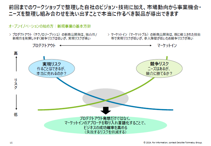 最後に、今後オープンイノベーションに取り組む際のポイントとして、新規事業の創出にあたっては、プロダクトアウト発想だけでなく、マーケットインのアプローチを取り入れることで失敗のリスクが低減することについて説明し、今後のワークショップを通じて自社技術の言語化や市場動向から事業機会・ニーズの整理を行っていくことを紹介しました。