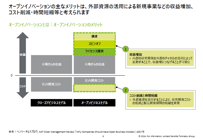 はじめに、オープンイノベーションとは、「経営資源と経営資源を組み合わせてサービス開発や、事業を創出すること」という基本概念を説明した上で、オープンイノベーションに取り組むメリットとして、自社が持たない技術や知見の獲得に加え、外部資源の活用により収益増加やコスト削減・時間短縮 等が期待できる点について説明しました。