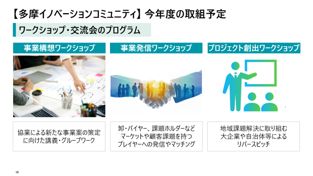 はじめに、多摩地域の特徴や課題などの多摩地域の外観をご紹介し、多摩イノベーションエコシステム促進事業の全体像についてご紹介しました。事業の1つの柱である多摩イノベーションコミュニティについて、その目的や目指すべき将来像について説明し、本年度実施するプログラムとして、「事業構想ワークショップ」「事業発信ワークショップ」「プロジェクト創出ワークショップ(リバースピッチ)」「アイデア具現化支援」についてご紹介しました。