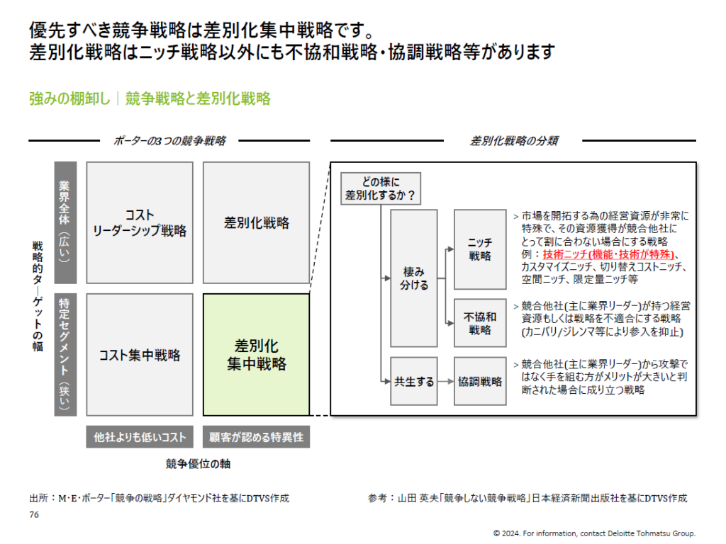 新規事業を検討する際に重要となる市場性・優位性・実現性の調査のうち、優位性の創出に向けて強みの棚卸しが重要な手段となっていることを説明しました。また事業の競争戦略においては、経営資源で劣るスタートアップ・中小企業は「差別化集中戦略」をとることが定石であり、参入障壁の形成により高収益化を実現することが可能となります。差別化集中戦略が成功した事例として、植物由来のバイオマスを主な原料として新素材を開発するSpiber株式会社が、自社開発の糸を使用した高級パーカーをアウトドアウェア・メーカーと共同販売することで、価格勝負にならずに高収益化が図られている事例を紹介しました。