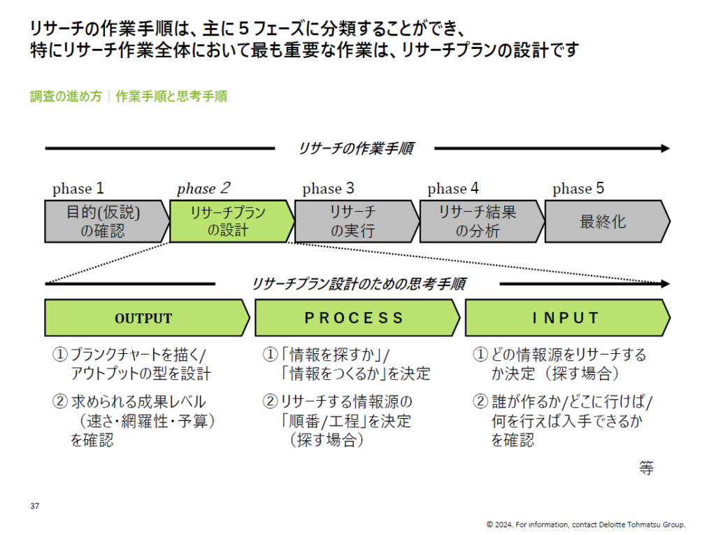 次に、調査の作業手順や調査結果の表現方法、調査で活用できる有力な情報源を紹介しました。調査作業においては、アウトプットイメージや求められる成果レベルの確認後、情報収集の方策や情報源について整理するといったリサーチプランの設計が最も重要であることについて説明しました。また、実際の情報源として、政策動向、業界動向、市場情報別に活用できる情報源についても紹介しました。