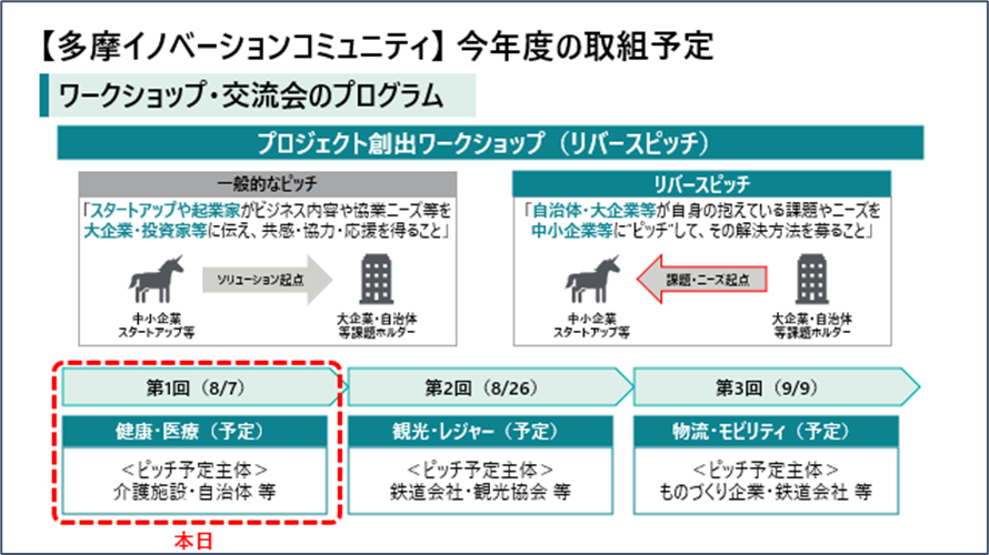 事業の一つの柱である多摩イノベーションコミュニティで今年度取り組んでいるイベントとして、3種類のワークショップについてご紹介しました。そのうちのひとつで、今回開催する「プロジェクト創出ワークショップ(リバースピッチ)」では、地域課題解決に取り組む大企業や自治体等が抱えている課題やニーズについてご紹介いただき、マーケットイン型のプロジェクト創出に繋げることを目的としています。