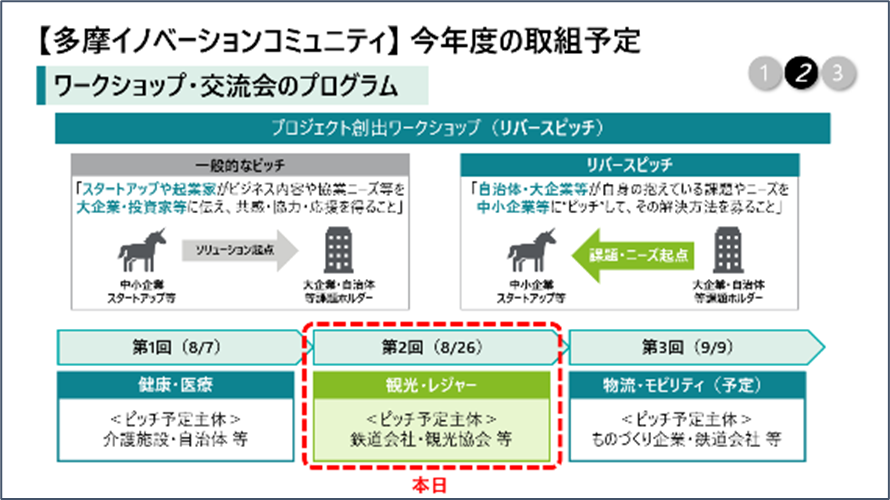 事業の一つの柱である多摩イノベーションコミュニティで今年度取り組んでいるイベントとして、3種類のワークショップについてご紹介しました。そのうちの一つで、今回開催する「プロジェクト創出ワークショップ(リバースピッチ)」では、地域課題解決に取り組む大企業や自治体等が抱えている課題やニーズについてご紹介いただき、マーケットイン型のプロジェクト創出に繋げることを目的としています。