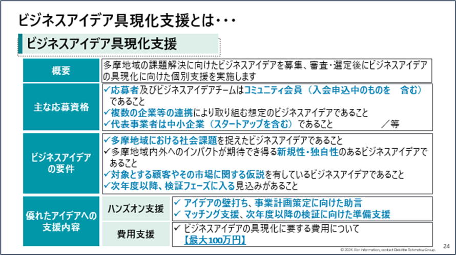 次に、ワークショップ等を通じて整理したビジネスアイデアの具現化に寄与する「ビジネスアイデア具現化支援」についてご説明しました。本取組では、多摩地域の課題解決に向けたビジネスアイデアを募集し、審査・選定後にビジネスアイデアの具現化に向けた個別支援、費用支援を実施します。