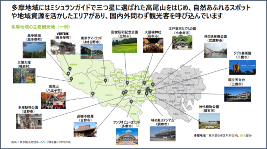 国では「持続可能な観光」「消費額拡大」「地方誘客促進」をキーワードに、「持続可能な観光地域づくり」「インバウンド回復」「国内交流拡大」に取り組む方針を打ち出しています。現在、日本は観光魅力度ランキングで世界3位であり、国際的な観光先・旅行先としての地位も確立され、また日本の地方・地域への注目度も高まっています。多摩地域においては、ミシュランガイドで三つ星に選ばれた高尾山をはじめ、自然あふれるスポットや地域資源を活かしたエリアを多数有しており、「観光・レジャー」の観点で高いポテンシャルを有する地域です。
