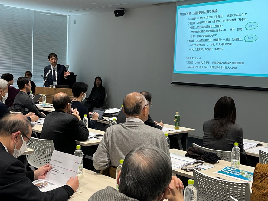 今回は、昨年度の「たま未来・産業フェア」で出会った中小企業や大手企業との連携によって、顧客課題の解決や販路拡大に繋がった経験を持つ株式会社NaITOや、優れた技術やサービスを持つ中小企業同士が連携し、顧客のワンストップニーズに応えるという新たなビジネスモデルを創出したI-OTA合同会社に協業の全体像や協業に至るまでの過程をご紹介いただいたほか、株式会社トラウムや株式会社コシダテックより、求める協業先や技術についてのピッチを行いました。