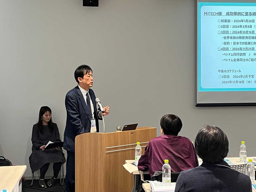 小峰様より、株式会社NaITOの事業紹介、昨年の「たま未来・産業フェア」で出会った企業との出会いから協業に至る過程や協業を成功させるためのポイントについてご紹介いただきました。