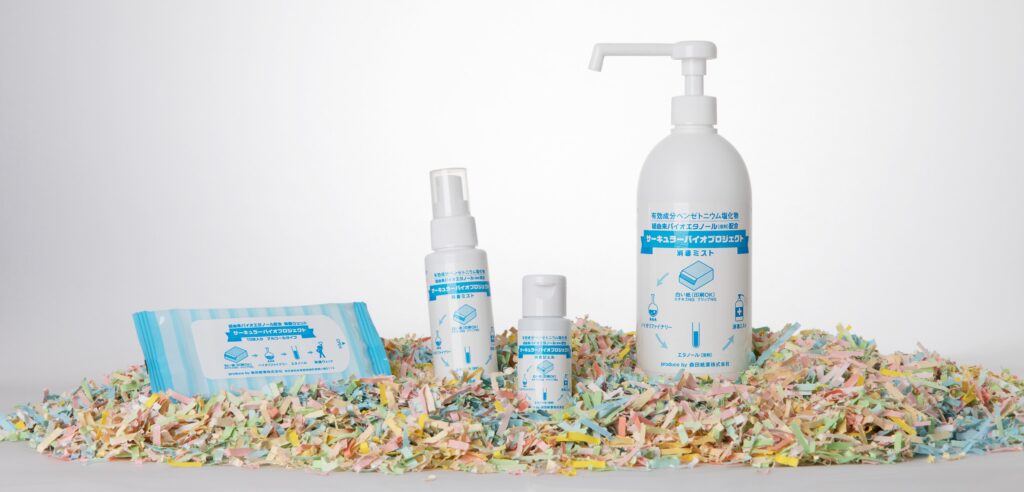 森田:事業化に当たってはバイオベンチャーと提携し、エタノールによるアルコール消毒液を作りました。ボトルの一部のデザインは、障害のあるアーティストの方が描いた作品を起用しECサイトで販売する取組も開始しています。他にも、消毒液や販売価格の一部を、必要としている国や地域へ寄付する仕組みの導入を検討しています。また、古紙からバイオジェット燃料を作り飛行機を飛ばす『紙ひこうきプロジェクト』も進めます。資源の乏しい日本ならではのプロジェクトだと自負しており、SDGS(持続可能な開発目標)の観点から選ばれるようになるでしょう。