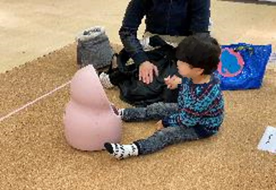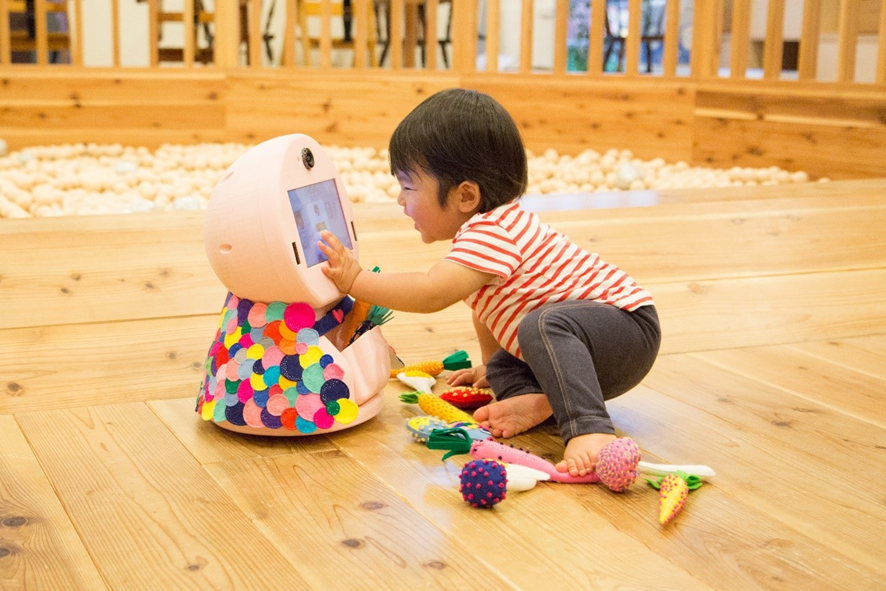 阿部:丸みを帯びた形状で倒れにくく壊れにくい、安全な形状としています。遠隔地から画面を通じて会話ができるだけでなく、画面の向こうからタブレットなどを使って操作し、ままごとなど身体を使った遊びによるコミュニケーションを実現しています。保育園でも、親が迎えに来るために保育士が多忙になる夕刻の時間帯などで利用されています。また、子どもの発達状況を遊びによって個別に把握し、ゲームによって発達を促す機能も組み込んでいます。具体的には、成長や年齢に応じたクイズや出されたお題に対して子どもがChiCaRoを通じてお絵描きをする機能など200種類の遊びで構成されています。