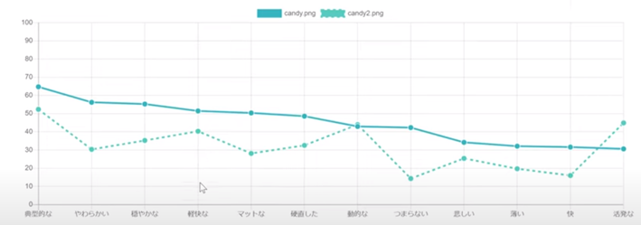 秋山:はい。パッケージデザインを作成する場合、いくつかの候補案ができた段階で、消費者にどのようなイメージで伝わるかを画像からAIが分析してくれます。具体的には4つのマーケティング的な観点のほか、43種類の感覚的観点での点数を算出することができます。例えば、この二つのパッケージデザインのどちらが「やわらかい」印象を抱くのか比較してみます。すると、左側のほうが「やわらかい」の数値が高いことが分かります。メーカーは消費者に訴求したいポイントに訴求できるデザインかを、こうした数値を見て確認することができます。