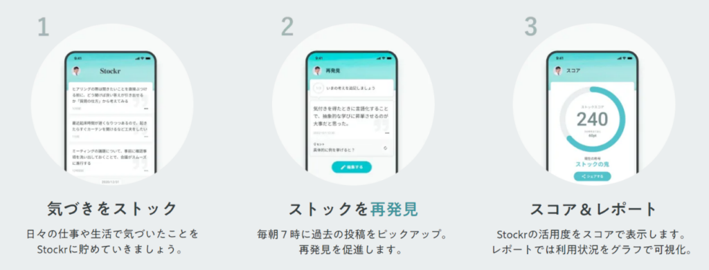 具体的には、日々の生活の中で生まれるいろいろな「気づき」を『Stockr』にためることで、翌日以降に自動でふりかえりをリマインドしてくれます。このリマインドは、過去のメモをランダムにピックアップして、忘れたころに自分の気づきを見られるという機能です。時間が経ってからメモを見ると、当時の感情などを切り離した状態で、客観的に自分を見られる、いわゆるメタ認知のきっかけになります。