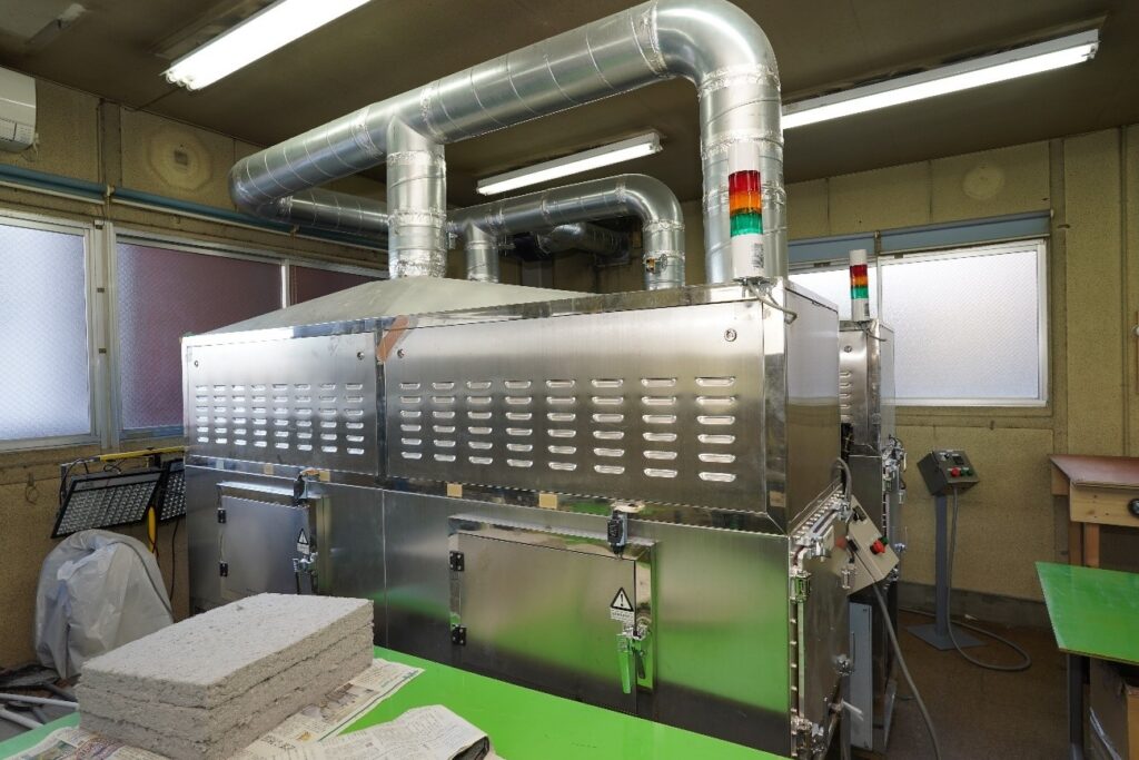 山田:私が理事長を務める『アイデア発明振興会』の有志メンバーたちと2002年から開発に着手した古紙解繊機が全ての始まりです。古紙解繊機は古紙を解繊セルローズ化(繊維素材を細かく分解してセルローズ状にするプロセス)し、リサイクルするための機械です。従来の解繊セルローズ化は大量の水を使って行われるため、大量のヘドロが発生し、その発生したヘドロを廃水処理しなければならず、コストがかかるという課題を抱えていました。私たちが開発した古紙解繊機は水をほとんど使わず、廃液を出さないで古紙をセルローズファイバー化することに成功しました。また、セルローズファイバーはそのままだと綿状(ふわふわの綿埃のような状態)なのですが、弊社はマイクロ波を用いた装置を開発してマット状(形が保たれている状態)に成形することに成功。その成形方法は特許も取得しています。