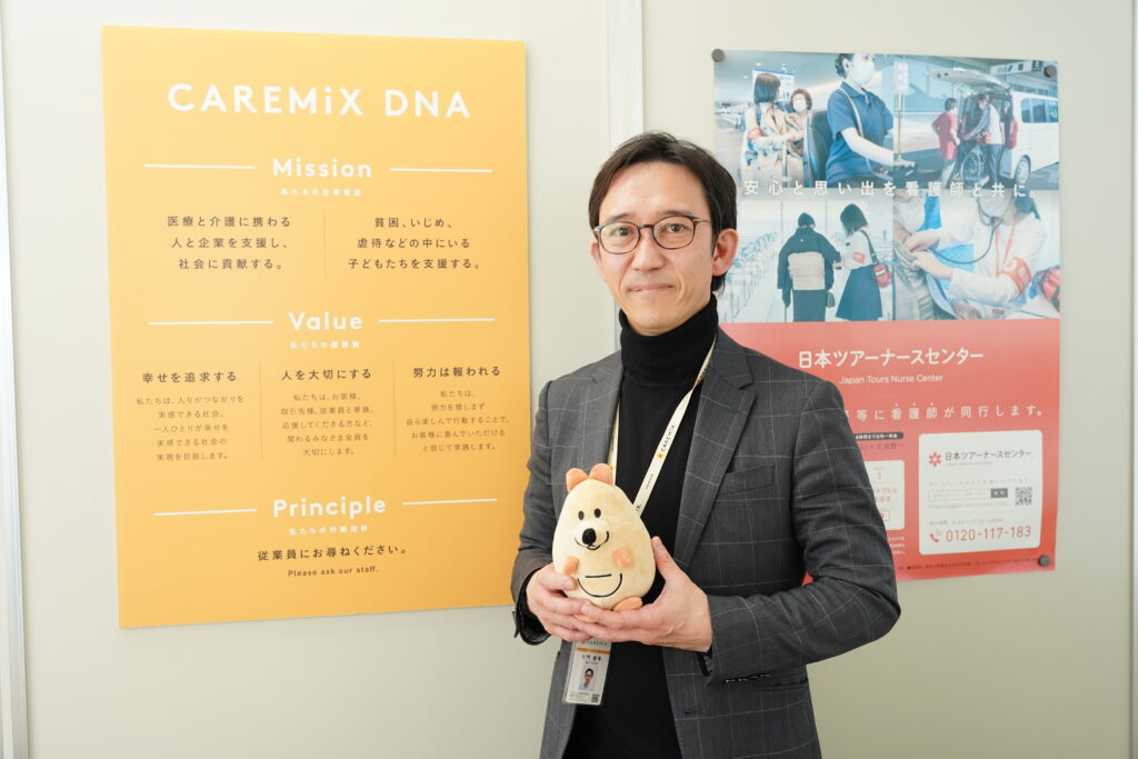 大門:現在は老人ホームの紹介事業が弊社の事業の柱となっていますが、今後は日本ツアーナースセンターをはじめ、昨年より運営を開始しました「日本訪問看護人材紹介センター(https://homenurse-agent.com/)」等の事業も伸ばしていきたいと考えています。また同時に会社の規模ももっと大きくしなければなりません。ただし、会社としての土台が強固でないと、人が増え規模が大きくなっても崩れてしまいます。そのために、創業から10年間、先を急がず、強い土台作りに注力してきました。従業員全員が同じ未来を描けるよう、弊社ではこれまで築き上げてきた企業理念や価値観、行動指針、コンプライアンス行動規範を総称して”ケアミックスDNA”と位置づけ、冊子にまとめています。日々の業務に取り組むなかで迷うこともあると思いますが、”ケアミックスDNA”を向かうべき方向を示す羅針盤としています。これからも、”ケアミックスDNA”を大切にしながら社会に役立つ仕事をしていきたいですね。