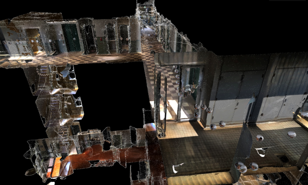 庄原:インフォモーフ3Dは、動画から3Dモデルを構築するサービスです。特別なカメラを必要とせず、スマホのカメラで撮影した動画から3D空間の構築を可能にするものです。クラウドにアップした3Dデータをそのまま見られるため、離れた場所からでもリモート会議などで確認できる手軽さが特長です。最初は災害現場で活用できないかと2019年9月頃から開発を始めたのですが、それだけでは需要が限られておりどうしてもビジネスにならないため、今後は建設系の企業や不動産企業向けに展開していこうと開発を進めています。これらの企業では、例えば現場監督が建設途中の建物をチェックした際に、修正箇所等を伝える手段として、3次元の地図が役に立ちます。