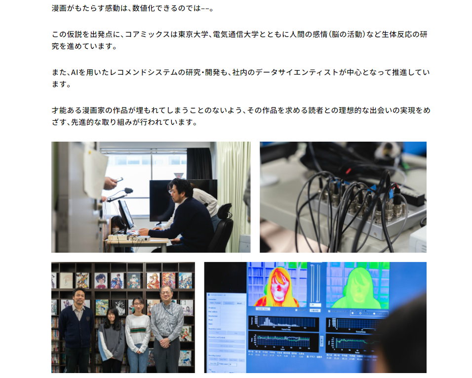高橋:吉祥寺にあるコアミックスという出版社から、漫画を読んでいるときの人の感情を可視化したいという要望があり、電気通信大学の板倉・水野研究室をコーディネートしました。板倉先生と水野先生は生体工学の専門家です。漫画を読んでいる状態を生体計測することで、感情を推定するという研究を行いました。コアミックスがこの研究を行った理由は、同社が若手の育成や発掘に積極的に取り組んでいることが背景にあります。というのも、名前の売れていない若手の作品はいくら良い漫画でもなかなか売れないそうです。そこで、良い作品を読みたい読者に実力のある若手の作品を届けられないか、といった思いからこの研究は始まりました。さらに、この研究は作家や編集者の育成にも活用できます。漫画はストーリーやコマ割りなど、ものすごく戦略的に考えて描かれています。その戦略どおり読者の脳が反応しているかどうかを測定することで、漫画を描く際の材料として活用できないかと考えているようです。
