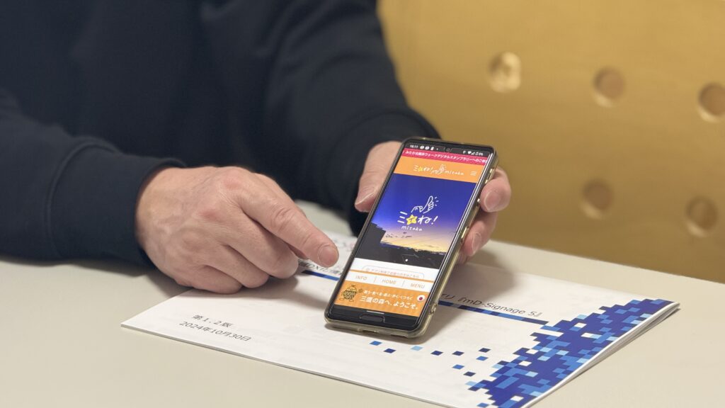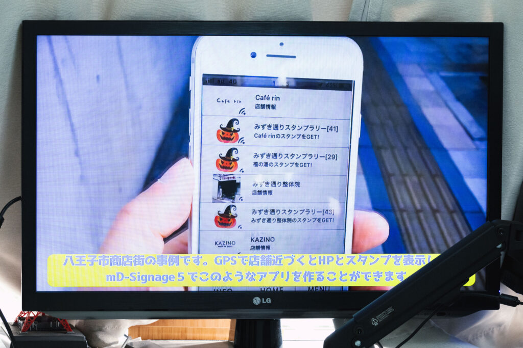 飯田:弊社では、地域情報のDX化を進めるアプリを開発しています。その中でも主力なのが、「mD-Signage(モバイルデジタルサイネージ)」というアプリです。簡単に言うと、スマートフォンをデジタルサイネージ化して、観光客や地域住民に向けて、必要な情報をその場で提供できる仕組みです。具体的には、GPSやBeacon(※1)、二次元コードを活用して、その場所とインターネット上のコンテンツを結びつけることができます。たとえば、八王子市を例にすると、市のホームページにはさまざまな情報が載っていて、YouTubeやSNSの発信もあります。しかし、外国人観光客が「どこに何の情報があるのかわからない」という状況になりがちですよね。そういった情報を整理して、わかりやすくアプリ化するというのがmD-Signageのコンセプトです。さらに、ただ情報をまとめるだけではなく、「その場所に行くと、必要な情報が自動的に出てくる」という仕組みになっています。たとえば、あるカフェの近くを通ると、「このお店のホームページはこちら」とか「本日のおすすめメニュー」といった情報がポップアップでスマホに表示されます。