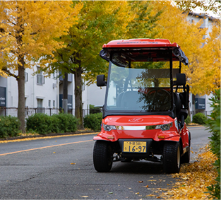 西:買い物や外出に困っている高齢者を対象とした送迎サービスで、2019年12月から実施しています。事業主は社会福祉法人悠々会(町田市で高齢者福祉事業を展開)で、UR都市機構が駐車スペースや電源設備などを提供、モビリティワークスが車両の提供や事業のコーディネートを担当します。週に3回、2台のカートが団地と商店街の間を走ります。利用料金は年間500円で、20数人が定期的に利用します。運転手は地元のボランティアの方にお願いしております。